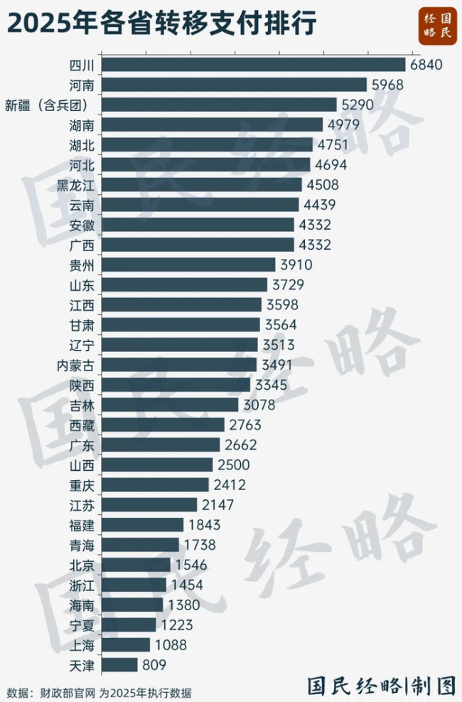 关键词: 2026-04-07 14:04:24  新浪财经 10万亿财政转移支付,被谁拿走了?流向揭秘!近日,官方发布了最新预算数据,2026年中央对地方转移支付总额达到10.42万亿元,连续四年超过10万亿元,创下新高。转移支付的本质是财政再分配,从发达省份收取资金,用于支持欠发达地区,以实现区域均衡和公共服务均等化。由于2026年的预算尚未完全分配到地方,因此以2025年的最终执行数为基准。财政转移支付主要流向西部、中部和东北地区,呈现出明显的政策倾斜特征。四川、河南、新疆(含兵团)、湖南、湖北、河北、黑龙江、云南、安徽、广西这十个省份的转移支付额超过4000亿元。其中,四川以6840亿元蝉联榜首,河南也接近6000亿元,大幅领先于其他省份。相比之下,粤苏鲁浙京沪等东部六省合计拿到的转移支付只有1.2万亿元,与其上缴的税收规模不成比例。衡量转移支付时,不能只看总量,还需考虑省情差异,特别是人口因素。西藏、新疆、青海、宁夏、黑龙江这五个省份的人均转移支付最高。西藏是唯一人均超过7万元的省份,300多万人获得2700多亿的转移支付,力度之大可见一斑。而被认为“切走最大蛋糕”的四川、河南,人均数据仅处于中游,远非想象中的那么可观。四川人均转移支付8200元,不及云南、广西、辽宁;河南只有6100元,甚至不及北京、重庆。经济第一大省广东,人均转移支付仅2070元,排在倒数第一,明显低于江浙沪等长三角地区。
